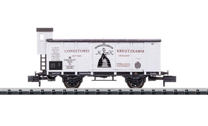 Aus diesem Anlass rollt ein schöner gedeckter Privat-Güterwagen der königlich sächsischen Staatseisenbahn aufs MINITRIX-Gleis.