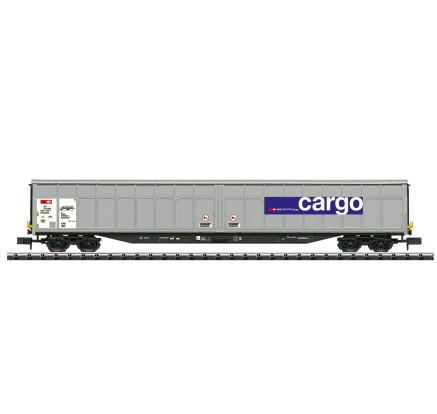Dieser lange Güterwagen mit öffnungsfähigen Seitenwänden gehört der SBB-Cargo. Wagen dieser Bauart (Habbillns) werden für den Transport verschiedenster, nässeempfindlicher Güter genutzt. Durch die großen Seitenöffungen ist der Umschlag der Güter sehr effizient möglich. (Dieser Wagen ist unter der Art.Nr. 48055 auch in H0 erhältlich.)